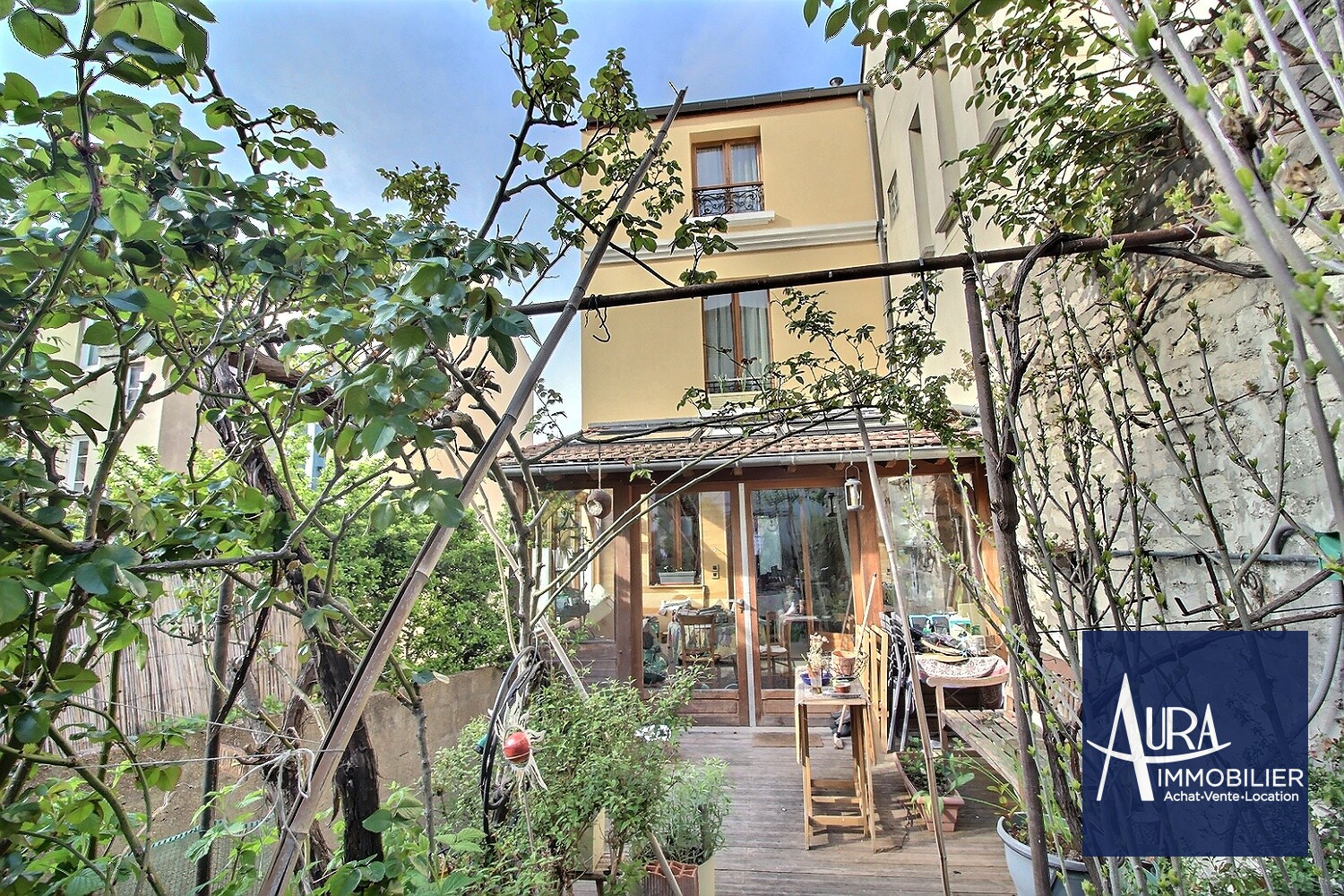 2 MAISONS SUR UNE MEME PARCELLE Exclusivite Aura immobilier. Métro Mairie des Lilas à 6 minutes à pied (400 mètres) Le Pré-Saint-Gervais – À la lisière des Lilas – Deux maisons de charme sur une même parcelle Situées dans une sente résidentielle paisible, ces deux maisons de campagne ( 98 m2 + 46 M2 ) partagent un terrain de 213 m². Elles peuvent être indépendamment divisées en deux lots distincts, un passage souterrain existant, facilite l’accès à la seconde habitation. Maison 1 – 86 m² + véranda de 12 m² = 98 m2 - 2 caves de 10 m2 chacune Ravalée récemment (il y a 2 ans), cette maison offre un cadre de vie moderne et chaleureux. Son isolation thermique a été optimisée par des panneaux de fibre de bois installés sur le pignon ouest. Rez-de-chaussée : vaste séjour avec poêle à bois, cuisine ouverte traversante, véranda lumineuse, terrasse intime et jardin arboré de 25 m². 1er étage : chambre avec vue sur le jardin, salle de bain, WC séparé et espace bureau/dressing. 2e étage : suite parentale avec salle de bain privative, WC indépendant, et grande baie vitrée ouvrant sur un balcon-terrasse avec une vue dégagée sur la plaine de France. Atout écologique : un capteur solaire couplé à une chaudière à condensation alimente un ballon de 300 litres pour l’eau chaude, permettant de réduire significativement la consommation énergétique. Maison 2 – 45 m² Implantée au fond du jardin, cette habitation a bénéficié d’une rénovation complète il y a moins de 10 ans. Isolée sur trois façades à l’aide de laine de bois, elle présente d’excellentes performances thermiques. Rez-de-chaussée : entrée, cuisine ouverte, chambre avec accès direct au jardin, salle d’eau et WC indépendant. Étage : mezzanine avec espace bureau, chambre supplémentaire équipée d’une douche et de toilettes. Les atouts majeurs : Ces deux maisons, nichées dans un écrin de verdure en cœur de ville, combinent tranquillité, confort et modularité. La possibilité de les séparer avec un accès autonome pour chacune en fait un bien rare et fonctionnel. Double exposition Nord - Sud - 2 caves de 10m2